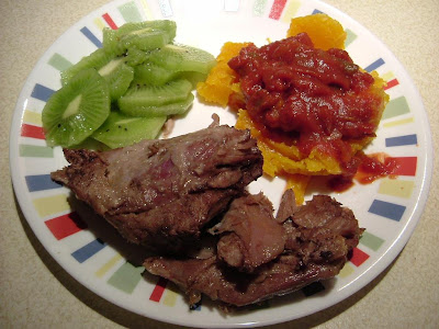 Dinner: No-hormone no-antibiotic lamb, organic squash, organic salsa, kiwi.